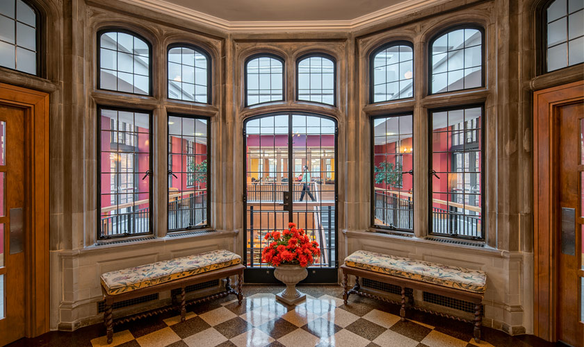 The North Addition, in 2001, with a covered entrance arcade that serves as the main entrance and drop-off for the school, a new 300 seat theater space and theater arts laboratory. A scenery shop is backstage along with green rooms, dressing rooms, and a dance studio. The existing gymnasium was renovated as part of this project. The addition also includes science laboratories, classrooms and commons.