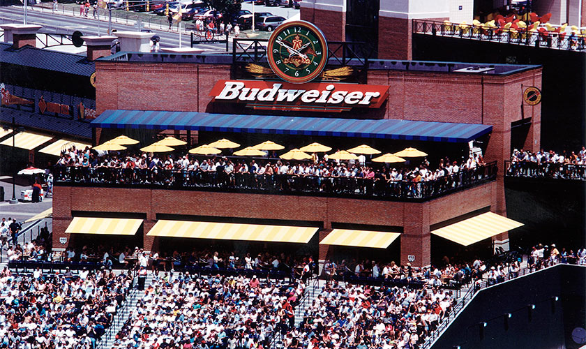 Braves Plaza is framed by two retail / concession pavilions, a number of interactive entertainment venues and the Turner Store and Amphitheater. The 100 foot tall image of the Hall of Fame baseball hit by Hank Aaron to break Babe Ruth’s all-time home run record was conceived and developed by D’AIQ as a signature of the ballpark.